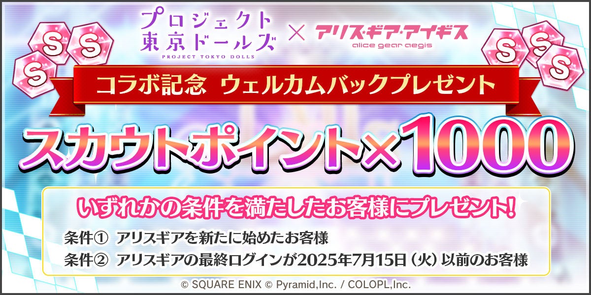 『プロジェクト東京ドールズ』とのコラボ開催を記念して、ゲームを新規で始めてくれたお客様と、復帰してくれたお客様を対象に、ゲーム内アイテム「スカウトポイント」をプレゼント中です。