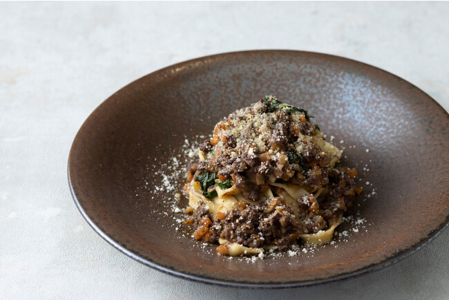 鴨と旬野菜をオーガニックバルサミコと赤ワインでじっくり煮込み、程よい酸昧に奥深いコクと旨みが広がる大人のラグーパスタ。生麺のタリアテッレと、ほんのり香るポルチーニがお酒にもよく合います。
