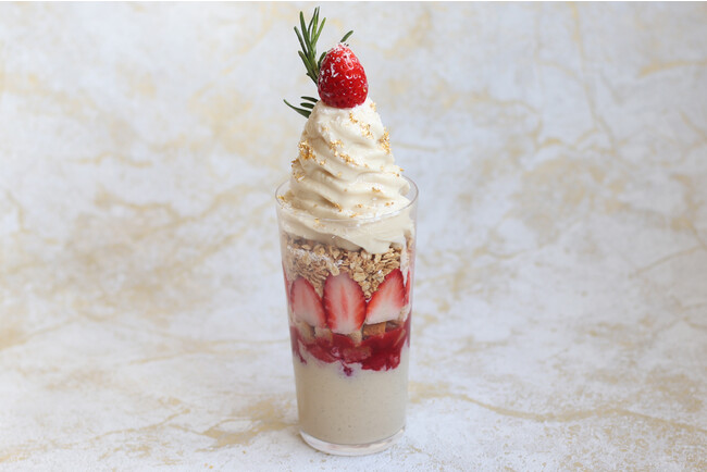 冬季限定スペシャルパフェがグランドメニューへ加わりました。自家製の有機豆乳バニラ寒天に、たっぷりのいちごや、自家製のヴィーガンカスタードクリーム、米粉のスポンジケーキなどを重ね、トップには有機豆乳甘酒ソフトクリームにココナッツファイン、金粉といちごで華やかに仕上げた一品。
