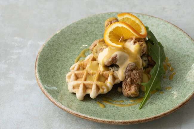 アメリカのソウルフードであるワッフルチキンを、ヴィーガン仕様にアレンジしました。ヴィーガンワッフルに餅粉でからっと揚げたベジからあげと、自家製タルタルソースやヴィーガンチェダーチーズソース、メープルマスタードを合わせたクセになる甘じょっぱい味わいをお楽しみください。