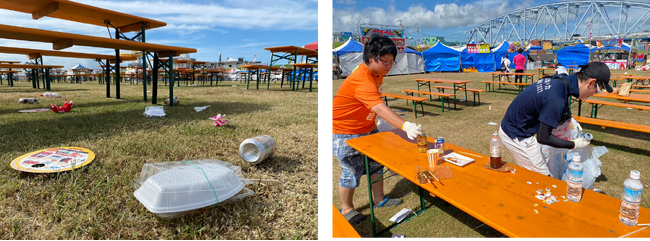 徳島県の一大イベント『吉野川フェスティバル2023』の会場で行われた徳島 STAGE。前日の花火大会で屋台が並ぶなか多くの見物客が訪れたこともあり、会場には空き缶やペットボトル、プラスチック容器や割り箸などのごみが大量に捨てられています。