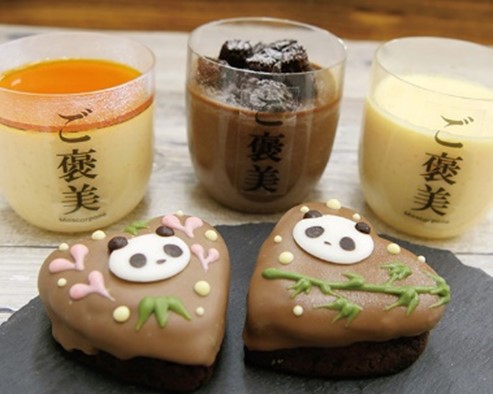 〈パティスリー・リアン〉(上)ご褒美プリン(1個) 432円から、(下)パンダデコレ(1個)各 486円/1階 和洋菓子イベントスペース
