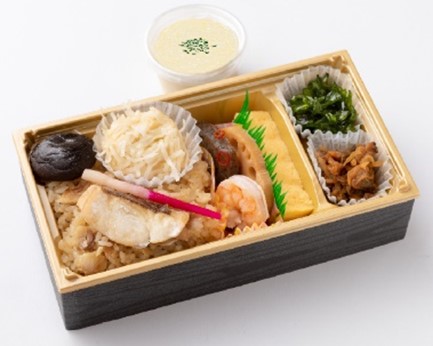九州産の天然真鯛を出汁で炊き込んだ「鯛めし」と、大分県産の原木乾しいたけなど、地元食材にこだわった一品。