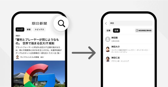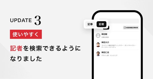 検索結果の画面に、「記者」ボタンを新たに設置。気になる記者の名前を検索いただくと、すぐに見つかるようになりました。