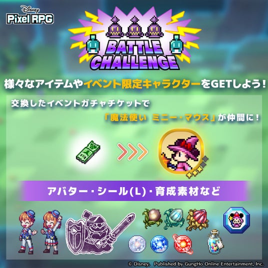 「iOS」および「Android(TM)」端末向けに好評配信中のスマートフォン向け完全新作RPG『ディズニー ピクセルRPG』にて、ゲーム内イベント「BATTLE CHALLENGE Vol.2」が本日11月13日(水)より開催中です。
