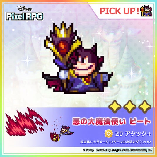 さらに、本日より『ディズニー ピクセルRPG』の世界に初登場となる新キャラクター「悪の大魔法使い ピート」がラインナップされたガチャも登場しています。ぜひゲーム内で、その姿をお確かめください。