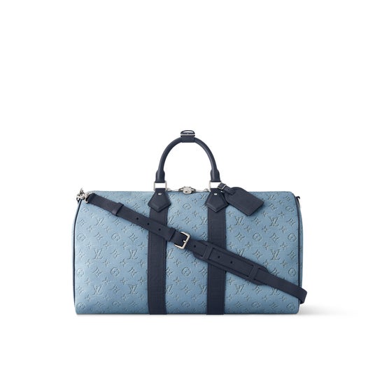 エレガントなレザーのトリミングが特徴的な「キーポル・バンドリエール 50」。サイドの補強バンドとロール仕上げのトップハンドルには、取外し可能なストラップやネームタグとマッチする同系色のレザーを施しました。上品なストライプのプリントがテキスタイルライニングにあしらわれた内装が魅力を放つ、メゾンならではの定番ウィークエンドバッグ。