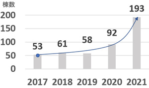 また、当社は自社施設をZEB化技術の効果検証やお客さまのショールームとしても活用したことで、2021年度のZEB建設実績は2020年度の2倍以上となる193棟になりました。