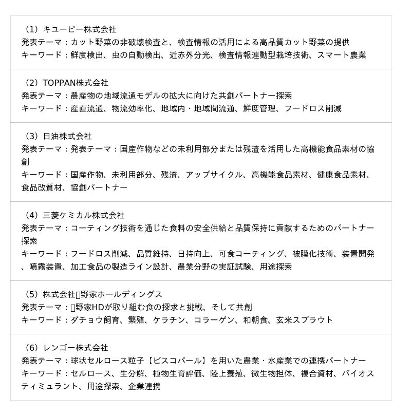 農林水産・食品分野の大手企業にとっては異分野も含めた連携パートナーとの協業のきっかけにしていただくとともに、中小企業をはじめとした地域企業の新しい事業への挑戦の機会となることを期待します。