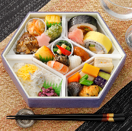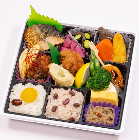 太巻寿司にちりめん御飯、煮物などの料理のほか、見た目も華やかに、食べごたえのあるお弁当です。