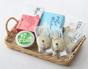 祝かまぼこ、金目鯛のあげたい、ワサビ漬、焼ぼこ×2、炙り焼きかま(コーンホタテ、枝豆)が入ったオリジナルの父の日セット。