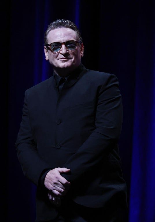 ダミアン・ボナールはメンズ コレクションより、ブラックのウール&シルクのピークドラペルタキシードとブラックの「オブリーク」コットンシャツを着用しました。