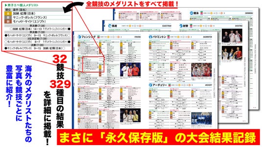 日本選手団全462選手すべての記録を写真付きで紹介。また、全32競技329種目の結果を詳細に掲載。海外メダリストたちの写真も競技ごとに豊富に紹介。