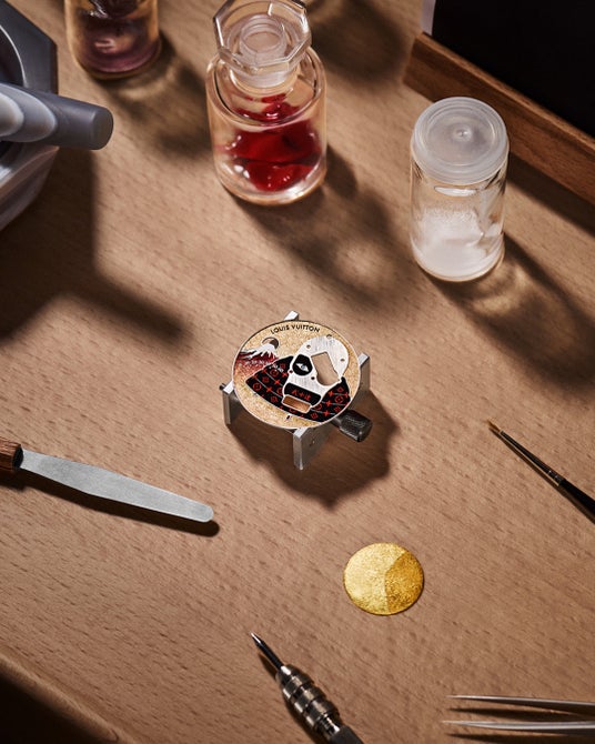 「ラ・ファブリク・デ・ザール」の最高峰の技術を体現し、ルイ・ヴィトンの冒険のエスプリをさらに捉えた「タンブール」のケースは、ルイ・ヴィトンのウォッチメイキング・コレクション史上初めて、ケースとベゼル共に全面的にエングレービングとエナメル加工が施されています。日本を旅するサムライや、富士山の向こうに沈むモノグラム・フラワー モチーフの真っ赤な太陽が描かれ、赤いエナメルの背景がケース全体を包み込みます。まず、ケースに数百もの小さな刻みを打ち込み、その後、半透明の赤いエナメルを塗布。高温で焼成する際にエナメルが細かい穴に入り込み、美しいグレイン効果が生まれます。割れのリスクを伴いながら、200時間の作業を要する工程です。