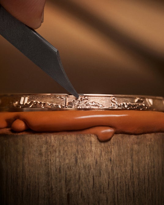 ダイアルの各要素は、職人たちに自身の技術を駆使する真の実験と革新を促し、「タンブール ブシドウ・オートマタ」を精緻な表現のキャンバスへと変貌させました。その結果、ディテール、立体感、そして好奇心を掻き立てるダイアルが誕生し、同時にサムライの独特の感情とダイナミズムを捉えています。例えば、兜は頭部を保護するために使用される鎧の一部ですが、サムライ個々のアイデンティティと地位の象徴でもあります。このシンボリズムに命を与えたのが、マスター・エングレーバーのディック・スティーンマンと彼のチーム。まずローズゴールドの兜を彫金し、その後、カラミン技法を用いて高温で焼成。これにより、焦げたような仕上がりの薄い炭化物層が形成され、その後手作業による再加工を経て、下地の黄金色が輝きを放つように仕上げられます。