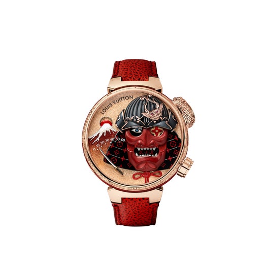 2025年、ルイ・ヴィトンは新作ウォッチ「タンブール ブシドウ・オートマタ」を発表します。ハイウォッチメイキングのサヴォアフェール(匠の技)と卓越したメティエダール(芸術的な手仕事)の限界を押し広げ続ける、メゾンのウォッチメイキングアトリエ「ラ・ファブリク・デュ・タン ルイ・ヴィトン」が手掛けるクリエーションの第3弾です。先祖代々受け継がれる文化や芸術、職人技を讃え、ダイアルの上で機械式ムーブメントが描写する表情の変化を通して語られる「タンブール オートマタ」の物語は、2021年のヨーロッパにおいて、「タンブール カルペ・ディエム・オートマタ」と共にはじまりました。写実的なスカルとヘビのモチーフが印象的な21世紀を代表するこのオートマタタイムピースは、ヴァニタスの象徴性を詩的でありながら反逆的な解釈で表現した作品。権威あるジュネーブ時計グランプリにおいて「オーダシティ賞」を受賞した同作品に続いて、その2年後には、「タンブール オペラ・オートマタ」が発表されました。「ラ・ファブリク・デュ・タン ルイ・ヴィトン」が舞台を中国に移し、色とりどりの仮面が次々と瞬時に入れ替わる魅惑的な伝統芸能、四川オペラの「変面」にインスピレーションを得て創造した作品です。
