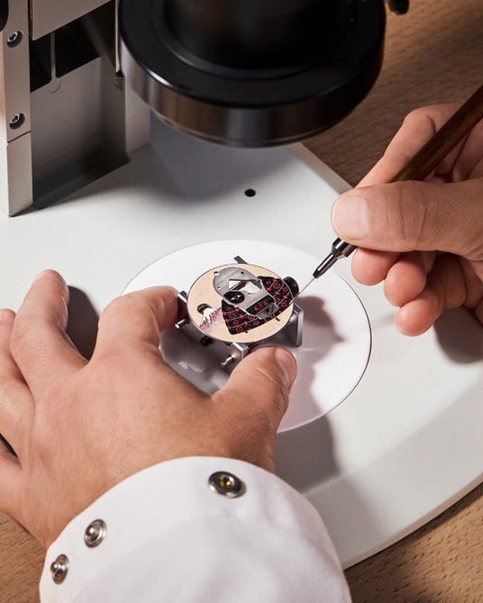 この他、紐の結び目、刀身と柄、そしてオートマタのプッシュボタン、クラウンにも精巧な彫刻が施されています。ケースバックもまた、生命力に満ち溢れ、光の戯れを捉えています。ダイアルの上で繰り広げられるストーリーに呼応する赤漆の妖怪は、ペルラージュ仕上げやコート・ド・ジュネーブ仕上げなどの伝統的なウォッチメイキングの装飾要素と並んで、高い技術を誇示しています。「タンブール ブシドウ・オートマタ」のダイアルとプッシュピース、クラウンのエングレービングには、合計140時間が費やされました。