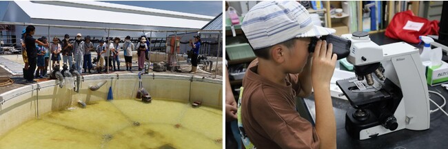 最後に、クマモト・オイスターの卵と子どもを顕微鏡で観察。卵を目の前でお母さんから取り出す様子を見て、子ども達は目を輝かせていました。牡蠣は卵から生まれるということにも驚いていました。クマモト・オイスターの子どもは、まだ1mmほどのサイズ。「赤ちゃんは砂のように小さいのにちゃんと貝の形をしています。濃縮したプランクトンを与えていましたが、貝が動いていて食べているのがちゃんとわかり驚きました」と感想を寄せてくれて、生命の神秘に触れたようです。