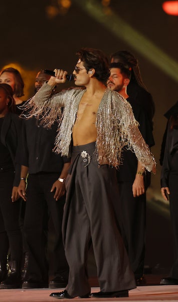 ラッキー・ラブは、スパンコール刺繍が施されたベージュのシルクとウールのクチュールジップカーディガンに、グレーのウールプリーツドレープパンツを纏い、シルバーの真鍮ブローチ、ディオール ブラック スーツ「A3U」サングラスに、ブラックのレザーシューズを合わせました。