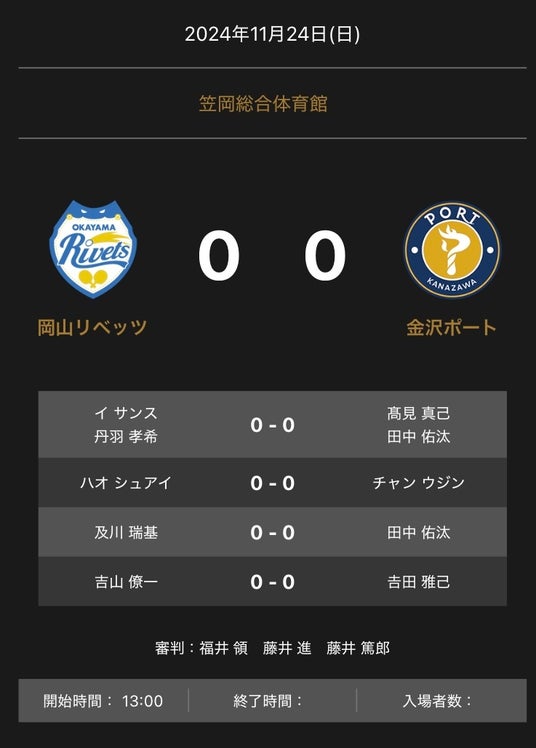 ノジマTリーグ 2024-2025シーズン 公式戦 11月24日開催の「岡山リベッツ vs 金沢ポート」の対戦オーダーを発表いたします。