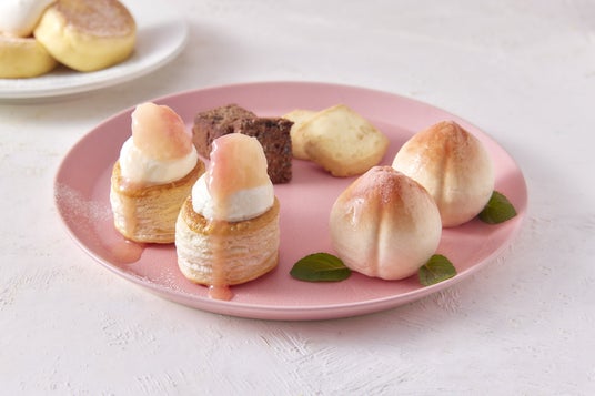 ▲下段:桃のブランマンジェ、桃のムース桃とレモンのサクサクカスタードパイ、焼き菓子