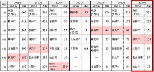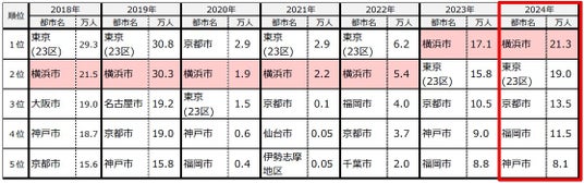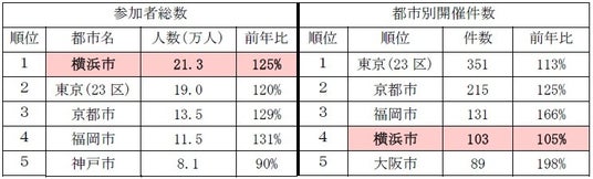 2024年国際会議統計における都市別国際会議について、横浜市は参加者総数が21.3万人で2年連続国内1位、また、開催件数は103件(国内4位)となりました。