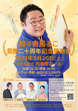 川鶴落語倶楽部主催、『鈴々舎馬るこ芸歴二十周年記念落語会』が2023年5月20日(土)に千代田区立内幸町ホール(東京都千代田区内幸町1丁目5-1)にて開催されます。