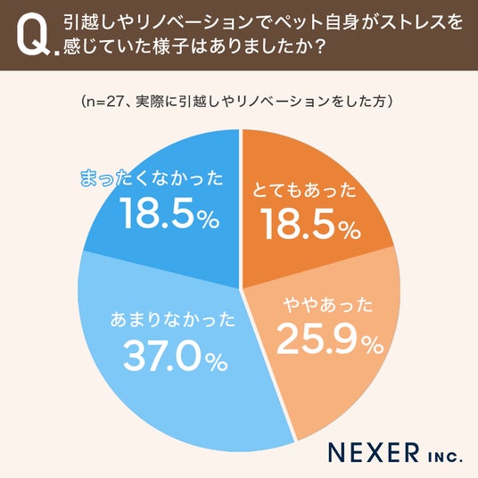 引っ越しやリノベーションがペットに与えるストレスは、飼い主さんにとって大きな懸念点ですが、「あまりなかった」という回答が最も多かったのは安心できる結果ですね。