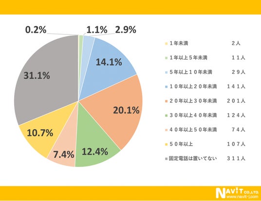 自宅に固定電話を設置してからの年数をたずねたアンケートで1番多かった回答は「20年以上30年未満」で20.1%でした。次に多かったのは「10年以上20年未満」で14.1%、「30年以上40年未満」が12.4%と続く結果になりました。