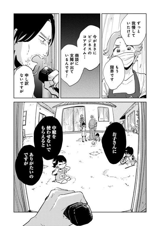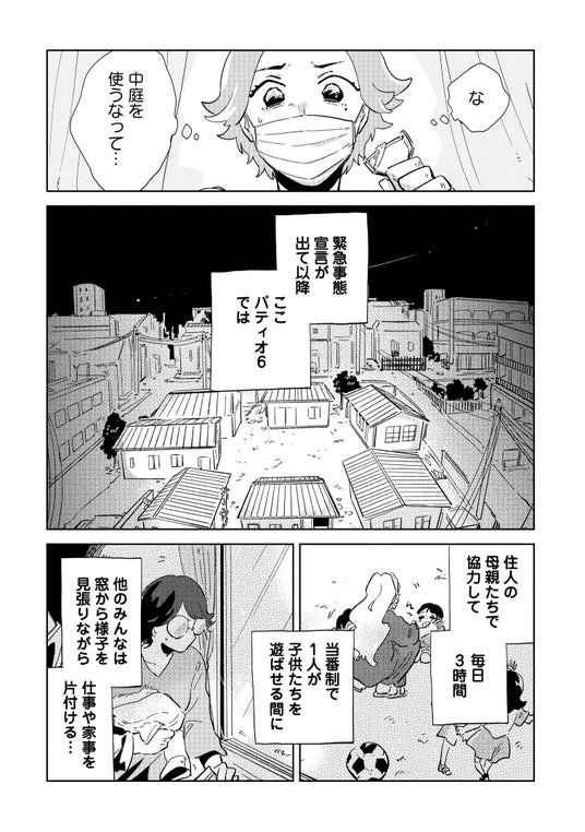 感染症の影響で行動が制限される中、集合住宅パティオ6の住人も在宅勤務・子育てを余儀なくされ、子どもたちの唯一の遊び場は住宅の中庭だけ。