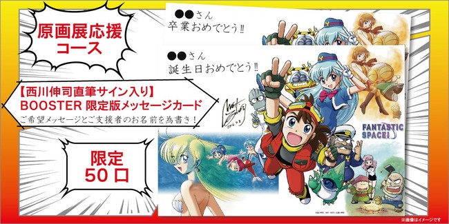 『西川伸司原画展 FANTASTIC SPACE』 メインビジュアルを印刷したメッセージカードに、ご支援者が希望するメッセージと支援者のお名前を為書きいたします。