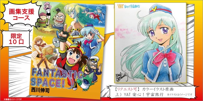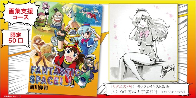 原画展を記念し、現存する原画や新作を完全収録した画業33周年の「メモリアル図録画集」の発行を目指しクラウドファンディングに挑戦。画集には単行本未収録の漫画作品の収録が決定されており、その作品はいずれも雑誌のみの掲載で幻とも云える貴重な作品ばかり!商業誌連載以外にも、西川氏自身が厳選したコミックマーケット用にファンのために描かれた作品のセレクト掲載もございます。まさに漫画家生活を総括する原画展『西川伸司原画展 FANTASTIC SPACE!』を完璧にコンプリートした画集が誕生します!