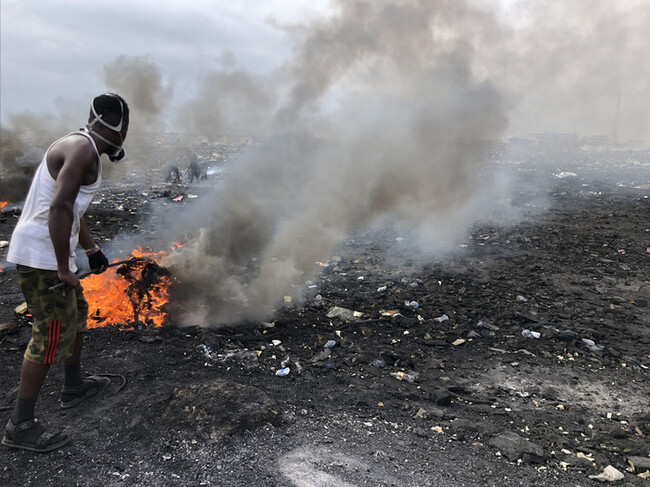 ▲ガーナのスラム街・アグボグブロシーの住人は、電子ゴミを燃やすことで得られる金属を売り、わずかな賃金を得ている。