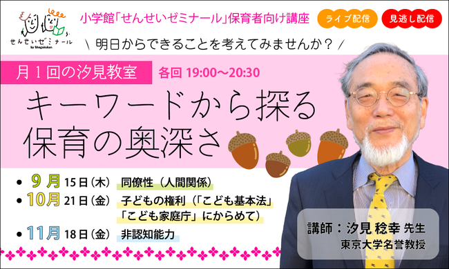 汐見稔幸先生による月1回のオンライン講座です。各回、キーワードを入り口に、汐見先生の講義+聞き手との対話を組み合わせて、保育の根本を考えます。