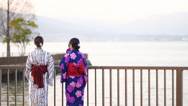 選べるレンタル浴衣を着用して、夕暮れのびわ湖畔や花火を背景に思い出の一枚を撮影。