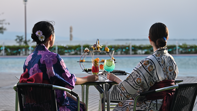 包まれながら夕涼みを堪能する2つのプラン、「<絶景×夕涼み>浴衣で楽しむ湖畔の涼 特等席で味わう絶景 優雅な夜の花火プラン」と、「『近江牛づくしフレンチフルコース』と花火を楽しむ夕べ」を提供いたします。