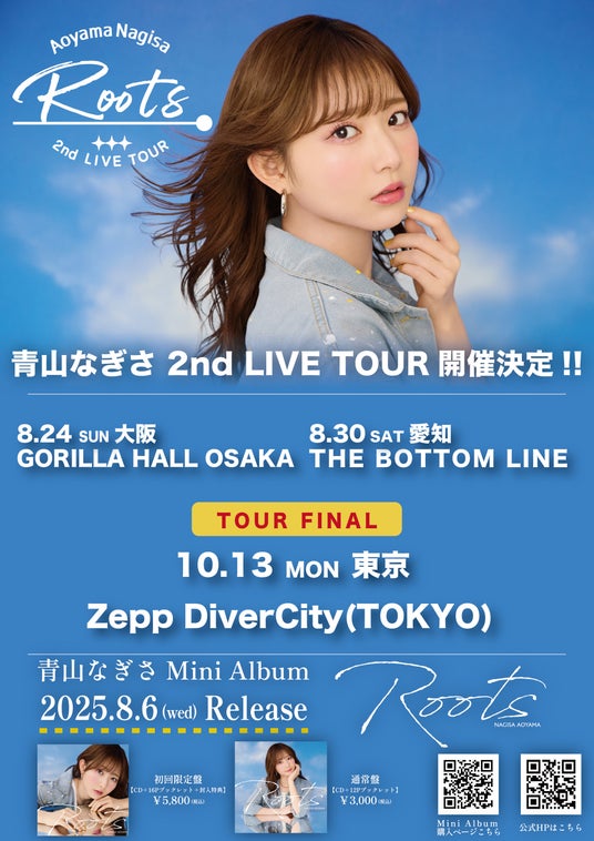 この『夏の夢』を含めた7曲が収録されたMini Album 『Roots』を携えて、青山なぎさは初めて東名阪3都市を巡るライブツアーを、この夏開催いたします。青山なぎさ 2nd LIVE TOUR『Roots』と題したこのツアーは、8月24日(日)大阪「GORILLA HALL OSAKA」公演を皮切りに、愛知「THE BOTTOM LINE」・東京「Zepp DiverCity(TOKYO)」と全3会場を巡ります。2024年11月に開催した1st LIVE『KAIHOU』で披露した楽曲に加えて、リード曲『夏の夢』、さらにミニアルバムに収録されている楽曲を今回のツアーで初披露する予定です。チケットの抽選受付は、5月23日(金)18:00よりファンクラブ「Apollo Bay Cruiser」にてスタートとなります。