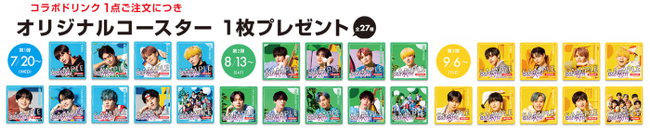 コラボドリンク1品ご注文につき、オリジナルコースターを全27種【第一弾:7/20~ 第二弾:8/13~ 第三弾:9/6~】の中からランダムで1枚プレゼントします。