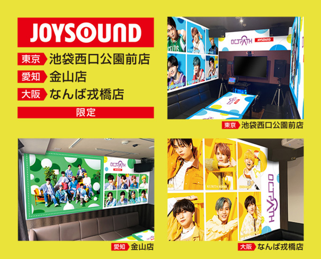 JOYSOUND池袋西口公園前店(東京)・JOYSOUND金山店(愛知)・JOYSOUNDなんば戎橋店(大阪)に展開するカラオケコラボルームは、ルーム内の壁面やテーブル、ドアに至るまで、OCTPATHの世界観で彩られ、ファンには堪らない空間となっております。さらに、カラオケコラボルーム利用者限定で利用特典として、JOYSOUND新譜本風ポストカードを1枚プレゼントします。