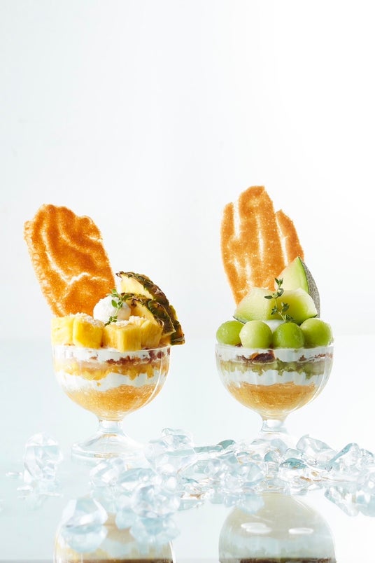 “ティーパフェ氷”は、「紅茶× パフェ× かき氷」を融合した新スイーツで毎年夏季にご好評いただいている商品です。今年は、創業当時から人気を博しているオリジナルのJ.S.ブレンドティーを使用したかき氷とクラッシュゼリーの食感がパフェの層へ加わり、更に進化しました。盛り付けられている自家製の大きなチュイールを割って、程よく溶けた“ティーパフェ氷”にディップして召し上がっていただくのがオススメです。種類は、「パインココナッツ」と「メロンミルク」の2種類をご用意。