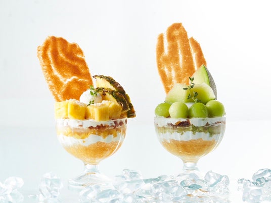 「パインココナッツ」は、甘くてジューシーなパイナップルや、ココナッツ、マンゴーパッションピューレなどのトロピカルな素材に、やさしい酸味とコクが味わえる北海道産のクリームチーズジェラートを合わせた夏にぴったりの“ティーパフェ氷”です。食べ進めていく先で、パッションフルーツの酸味が感じられるような層の構成になっています。