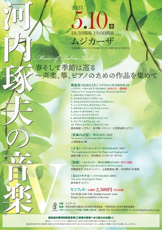 『河内琢夫の音楽IV』春そして季節は巡る~声楽、箏、ピアノのための作品を集めて が2023年5月10日(水)にムジカーザ(東京都渋谷区西原3-33-1)にて開催されます。