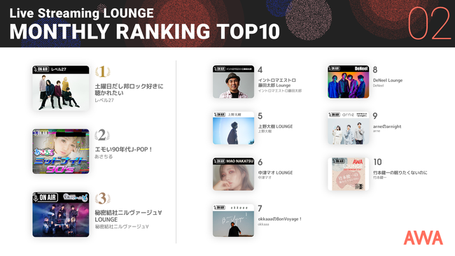 AWA株式会社(本社:東京都港区、代表取締役CEO:冨樫晃己)が運営する、サブスクリプション型(定額制)音楽ストリーミングサービス「AWA(アワ)」は、昨年12月に音声ライブ配信機能とギフティング機能「応援メッセージ」の正式提供を開始。すでに、50組以上のアーティストによって、音声ライブ配信を利用した「ラジオ配信ラウンジ」が開催されています。今回、2022年2月1日(火)から2月28日(月)までに開催された、ラジオ配信ラウンジの視聴数、開催頻度、リアクション数などを総合して、人気ランキングTOP10を発表いたしました。