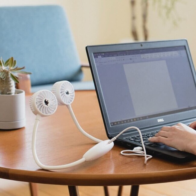首掛け扇風機は、移動中はもちろん、アームを変形してデスクで使うのもおすすめ!