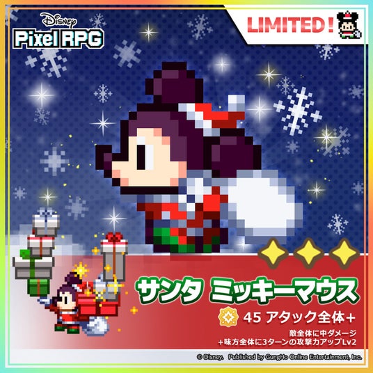 あわせて、ゲーム内ではクリスマスの季節にぴったりの「サンタ ミッキーマウス」がラインナップされた期間限定ガチャを開催中。サンタ衣装を身にまとった特別な見た目だけでなく、“全体攻撃+味方の攻撃力アップ”という、これまでにない構成のスキルを持った新キャラクターです。期間中にログインすることで、衣装やプレミアムガチャチケットがもらえる「クリスマスログインボーナス」も実施中ですので、新たな装いでさらに魅力を増したミッキーマウスの姿とともに、ぜひお見逃しなく。