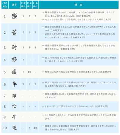 就活を表す漢字一文字は「楽」が2年連続1位。「疲」「辛」「早」が順位を上げる結果に