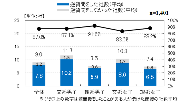 逆質問した社数平均と、面接を受けた社数のうち逆質問をした割合*