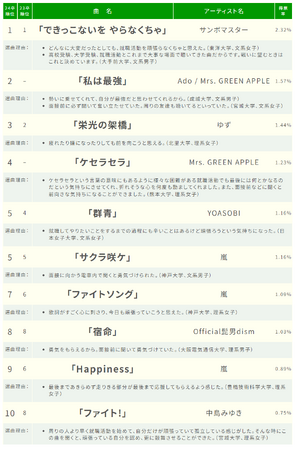 就活のテーマ曲1位は2年連続でサンボマスターの「できっこないを やらなくちゃ」。Adoの「私は最強」、Mrs. GREEN APPLEの「ケセラセラ」が初ランクイン【図1】