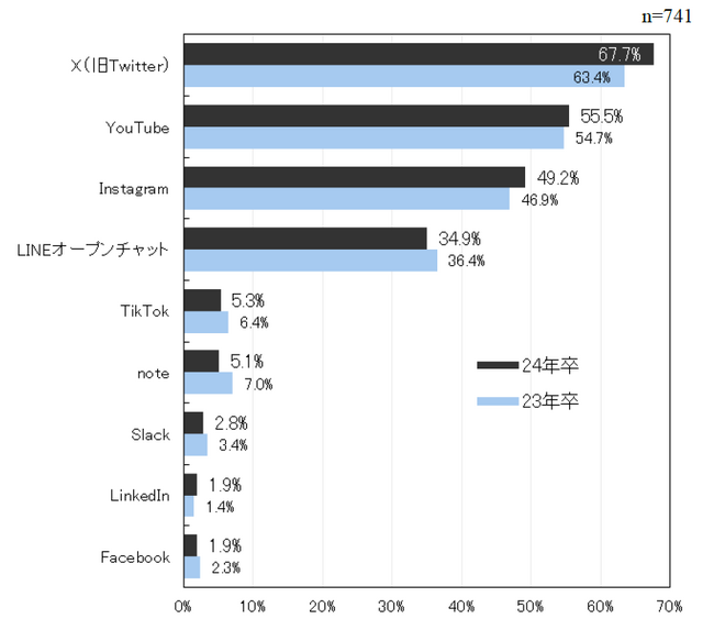 就職活動における情報収集でSNSを積極的に活用したか聞いたところ、「積極的に活用した」は前年比0.8pt減の10.8%、「一定の範囲で活用した」は前年比2.4pt減の35.4%だった。活用した割合はあわせて46.2%(前年比3.2pt減)で、前年より微減したが約半数の学生が活用していた。実際に活用したSNSで最も割合が高かったのは3年連続で「X(旧Twitter)」で前年比4.3pt増の67.7%だった。