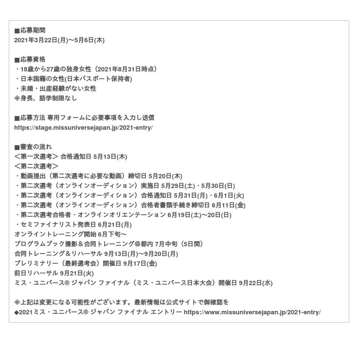 ◆2021ミス・ユニバース(R) ジャパン ファイナル エントリー https://www.missuniversejapan.jp/2021-entry/